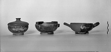 | Description: | Three joining fragments preserve base, much of body and most of one handle. Rim fitted for lid. A small open bowl with ring foot. Black glaze except under foot. | |