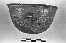 | Description: | Mended from many pieces; one non-joining fragment. About half the rim and rather less than half the body preserved; bottom missing. Restored in plaster. Out-turned lip, marked off outside by a scraped line. Upper zone (rim): ovules, dolphins, wave pattern, guilloche between incised lines. Body: long leaves alternating with flowers on tall stems. A crack in the mold is visible. Very delicate work. Metallic glaze, black to reddish-brown. Cf. Agora XXII, no. 49, p. 50. ADDENDA From metal original. Cf. P 5813, P 11436. | |