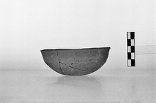 Description:   Fragments of rim and body missing; restored in plaster. A hemispherical footless bowl with very slightly out-turned rim, the inner surface flat and down-sloping.
