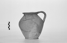 ADDENDA P 16282: Round mouth sitting practically on body. Deep ovoid body on flat base slightly projecting. Plain band handle from lip.