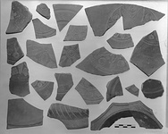 | Description: | Late Roman B fragment mended from two pieces. Two sides of the octagonal rim and parts of two others are preserved; sides slightly concave. A groove follows the outline of the sides, another follows the circumference of the bowl. Rim slightly down-sloping. Red clay; thin red glaze. Cf. P 9656. | |