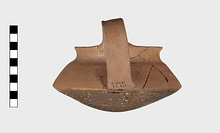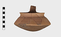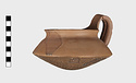 | Description: | About half of upper body and much of the strainer-bottom missing; restored in plaster. The bottom, pierced with a great many small holes, is shaped like an inverted broad low cone, but it was probably rounded rather than pointed at the center, which is missing. The upper part of the pot, with solid walls, joins the bottom at a sharp angle. The upper part is low, and at the top curves outward to form a plain lip. Vertical strap handle from the angular juncture of top and bottom parts to lip; the handle arches well above the lip. Rather coarse reddish clay with bits; cooking pot fabric. The under-surface of the strainer is blackened, as though by (slight) contact with fire. | |