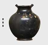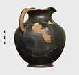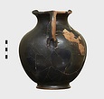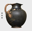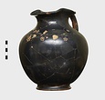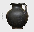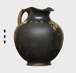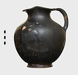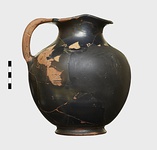 | Description: | Parts of rim and much of walls missing; restored in plaster. Oinochoe of Type III, the shoulder rather high, the high ring foot very neatly made, concave in profile outside and in, and set off from the wall outside by a sharp ridge. The mouth is broadly trefoiled, the handle, round in section is attached at the lip with shouldering. Around the shoulder is painted a large ivy wreath formed of two long sprays which start at the back and meet at the center front in a large berry cluster. The central stem is gently undulating as are also the subsidiary stems to which leaves and berry clusters are alternately added. Excellent black glaze outside; inside to base of neck; brown wash below. The glaze nearly all worn off the handle, and in a patch on one side. Underside of foot unglazed. The decoration is all in added clay, thick for the berries, thinner for the leaves, very thin and much perished for the stems. Cf. the cup with similar decoration and from a similar context: P 2322 (Hesperia 4 (1935), p. 480, fig. 8; p. 501, fig. 19). | |