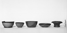 | Description: | Part of floor and foot missing. Small open bowl on flat disk base. The rounded wall thickens toward the top to form a rather broad plain rounded rim. Good black glaze on rim and outer edge of foot; walls inside and out glazed sealing-wax red, much peeled. On reserved underside of foot, a single letter, scratched: Κ | |