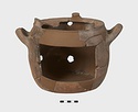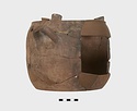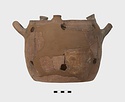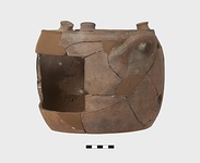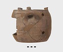 | Description: | Fragments missing from floor, wall and rim, with part of one handle, two of the horizontal lugs and one vertical lug; restored in plaster. Flat-bottomed, with bulging walls, narrow down-sloping rim and two horizontal handles set near top of wall and up-tilted. The rim is extended outward at three points to form horizontal lugs. Set on its top, alternating with these, are three vertical knobs or lugs. In one side of the wall is cut a large rectangular fire-hole; in the other are pierced two rows of three holes in each. Brown micaceous cooking ware fabric, considerably grayed from use. Cf. P 16108. | |