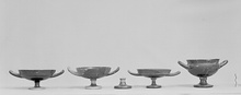 | Description: | Fragments of wall and chips from rim missing. A deep round-bodied cup with straight flaring rim, the bowl separated from the substantial stem by a heavy moulded ring painted in added purple. The stem and foot form a continuous curve; the edge of the foot is rounded, the underside slopes upward to a hollow cone. Heavy up-tilted handles, rounded at the ends, set on wall just below rim. Very good black glaze; the underside within the foot reserved. | |