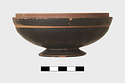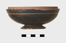 | Description: | Intact, save for chip from rim. High flaring ring foot and rounded body; reserved groove outside below rim; upstanding inner rim to hold lid. Black glaze all over except: bottom of bowl inside foot, resting surface of foot, groove below rim, and upper surface of rim and outer face of inner rim, both the latter painted purple. Double band of purple around center of floor; another pair of purple bands halfway to rim inside. | |