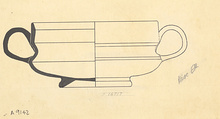 | Description: | One handle and fragments of rim, body and foot missing. One non-joining fragment of rim. Two vertical handles, grooved. Straight rim, below which a concavity; slightly sloping floor. Ring foot. Red glaze inside and out. | |