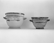 | Description: | Both handles and fragments of rim, body and foot missing; restored in plaster. Glazed torus lip, below which two bands of glaze. Outer face of spreading foot also glazed. Good black glaze on interior. | |