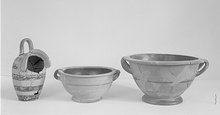 | Description: | Fragments missing throughout; restored in plaster. Flaring flat-topped rim with two lines of dilute glaze. Single band of glaze around body. Outer face of foot glazed. Handles rise and are attached to rim. Interior, dull black to reddish glaze. | |