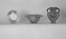 | Description: | Fragments missing throughout; restored in plaster. Flaring lip. Wide mouth and neck. Squat egg-shaped body. Spreading foot with torus edge. Underside of foot slightly concave. Band handles. Pinkish buff clay. Light buff slip, much worn. | |