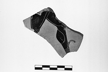 | Description: | Possibly from side of amphora. Hermes advancing right; lower part of body preserved, right leg from upper part of thigh to knee, and left leg as far as the ankle. The lower hem of the chiton shows, bordered with white dots and an incised stopped maeander. Applied red on kneecap and the wing of his boot. Red wash over the reserved background; brown wash on the interior. | |