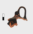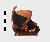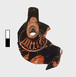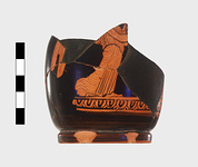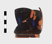 | Description: | Nine pieces make up to two non-joining fragments. a) Handle, part of neck and of body with heads of two figures. b) Foot and nearly half of body. Tongue pattern on lower neck; egg pattern as ground line for figures. Standing draped woman right, holding an oval object; facing her, the upper part of a winged figure, apparently truncated. | |