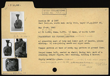 | Description: | a) Most of body and lower part of handle, pieces missing. b) Non-joining mouth and upper neck. Restored in plaster. Tongue pattern at base of neck; egg pattern as ground line. Draped woman left, seated on chair; facing her, part of a standing draped figure, head missing, holding a mirror. Highly metallic glaze, irridescent. | |