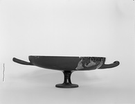 | Description: | Three non-joining fragments. a) Mended from eight pieces preserving part of foot, stem, most of floor with part of rim and a handle stump. b) Four joining pieces from rim and part of body. c) Body fragment. Restored in plaster. Medallion inside: border of crosses and maeander; two youths, right. The one at left, standing draped, with basin behind him; the other semi-draped, holds strygil in one hand and looks back. Exterior decoration: elaborate scrolls of palmettes under and to each side of handle attachments. On one side of cup, a standing draped figure between two nude ones (upper parts of central and right figures on non-joining fragment b). On the other side of cup, at left a standing draped figure, a nude leg only preserved of middle figure, and standing semi-draped figure at right (partially preserved on fragment c). | |