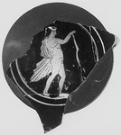 | Description: | Three joining fragments preserve foot and center of floor. Moulded ring foot and cushioned bottom. Interior: plain bands around central medallion; within it a semi-draped figure with crooked staff walking right. Fillet of thinned clay paint around head. Exterior: undecorated, plain black glaze. | |