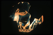 | Description: | Six joining pieces preserve part of body and shoulder. Parts of three figures preserved, from left: nude boy, right, holding a bird on his extended arm; a three-legged table with a jug; nude hips and legs of another figure, right; table with a wreathed jug and uncertain object; legs of a nude figure left. Thinned clay paint for crown of first figure, and for round dot on edge of second table. Heavy white for object, cloak?, hanging over legs of central figure, and thin white for uncertain object on second table. | |