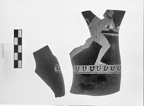 | Description: | a) Five joining pieces from the body preserve part of the egg ground line, and a nude silen running right, carrying a table, with cakes(?). b) Fragment from lower body preserving one end of ground line. Added white for various objects on table. | |