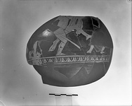 | Description: | Many fragments mending to two. a) Seventeen pieces preserve large part of lower half of figured scene and the ground line of egg pattern. Scene framed at sides by plain reserved bands. Parts of three figures, from left; standing draped figure right; nude male, right, dancing holding staff with drapery flung over extended arm; feet and part of shoulder of another nude figure dancing right. b) Part of reserved band at left of scene and the head and shoulders of the left figure on fragment a), who is playing a double flute. Added white for wreath on head. | |