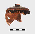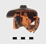 | Description: | Two non-joining fragments. a) Most of shoulder and part of upper body, made up from three pieces. Heads of two women right, the front one carrying a large bowl with handle, uncertain object at edge of break. b) Bit of the shoulder and a large part of one side of the body, made up of three pieces. Parts of three figures, from left: front part, head missing, of draped figure, right; seated nude male, with boots and staff, right; dancing maenad, left, draped, sword in one hand, dead animal in the other. Palmette pattern on shoulder and border of egg pattern at its base. Ground line of egg pattern. | |