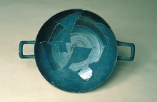 | Description: | Eleven joining fragments preserve about one-third of rim and most of floor; both handles and scattered pieces missing. Restored in plaster. Moulded ring foot; rim offset on inside only. Stamped on floor, from center out: a star, surrounded by fine double groove; a zone of tongue pattern. Good black glaze. Thin fabric. | |
