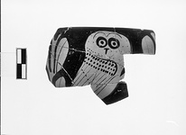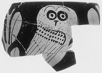 Description:   Six joining fragments preserve much of wall and rim at one side. At center an owl, right; olive branch to each side.