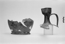 | Description: | Upper and lower parts, each mended from many fragments, do not join. High flaring ring foot; deep rounded body; high narrow neck; bell-shaped mouth pinched in at front; wide band handle, shoulder to just below mouth. Two grooves around shoulder at base of neck, two more below handle attachment. Black glaze over all outside; thin wash inside. | |
