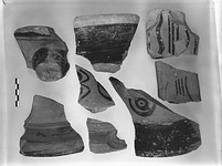 | Description: | Fragment from neck of large neck amphora. Part of circle and wavy lines. Red paint. Smooth, almost lustrous surface. Subgeometric style. | |