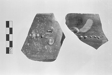 | Description: | Two non-joining rim fragments. a) Full height of rim and edge of inturned lower wall and beginning of handle attachment just below rim preserved. b) Rim fragment and edge of handle attachment. From a bowl with concave floor and high straight rim ending in a plain lip; vertical handles. Relief decoration: a horizontal row of dots with anchor-shaped decoration at each end. Clay pink to gray; dull black glaze outside, black to red on upper part only of inside. | |