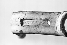 | Description: | Flat angular lagynos handle, ribbed down the middle, and part of narrow round neck preserved. Stamped on top of handle: Α Τ Τ Α Λ Ο Υ Buff clay with pink core; heavy white slip over all, somewhat peeled. | |