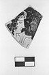 | Description: | Fragment from wall of a krater; glazed inside. Face and left shoulder of a draped youth, right. | |