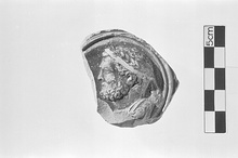 | Description: | Medallion broken all around and some of circle missing to left. Bearded male head, left, wearing diadem and wreath. Pinkish-buff clay; thin brown glaze. | |