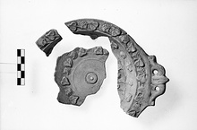 | Description: | Two non-joining fragments. a) Mended from two pieces, preserves part of rim and body and one handle. b) Part of floor and body. From a shallow bowl with heavy ring foot and flat rim to which a double pierced handle, leaf and volutes, attached. In relief on rim and body, ivy leaves and berries. Thin fabric of gray buff clay once covered with silvery vitreous glaze, now preserved in holes and grooves of handle, in imitation of silver ware. | |