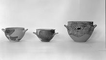 Description:   About half the body and one handle missing; restored in plaster. Deep body with flat bottom; straight rim, slightly inset. Lower body glazed to handle zone, which is divided into five panels by quadruple verticals; in outermost panel, crosshatching; in next, hatched quatrefoils with triangles between bottom leaves; in central panel, opposed crosshatched triangles with similar triangles at sides. On rim, bands and a zone of blobs linked by diagonals.