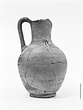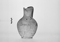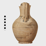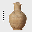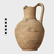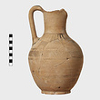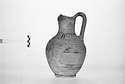 | Description: | Most of trefoil mouth and small fragments of body restored; broken and mended in antiquity; two clamp or string holes preserved in neck, just below rim. Ring foot, too low for convex bottom, which makes pot sit unevenly; ovoid body; straight neck; band handle. Foot glazed; two bands around lower body; a wide and two narrow bands at point of greatest circumference. On shoulder at front, two sets of compass-drawn concentric circles, solid at the middle; tails hanging from band around base of neck to each side. The mouth was glazed. St. Andrew's cross on handle; glazed ring around its lower attachment. Inner edge of mouth glazed. Buff to grayish clay. Dull black glaze, much peeled. | |