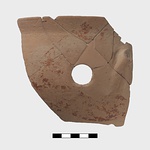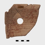 | Description: | Part of the body and rim, with the stump of one handle attachment preserved. Round hole, cut before firing, beside handle. Inside glazed; outside, broad rough band of glaze around body(?) below handles, and around outside of hole beside handle, to rim. Very soft buff clay, much worn. Dull red glaze, much peeled. | |