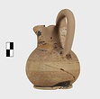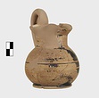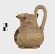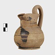 | Description: | Handle and fragments of mouth and body restored in plaster. Low base; squat round body; short straight neck; trefoil mouth, slightly crooked; rolled vertical handle. Black glaze overall, badly peeled; reserved band at level of greatest diameter, filled with purple stripe. | |