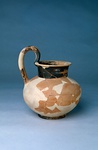 | Description: | Gaps filled with plaster. Ring foot; squat rounded body; straight neck flaring at top to flat-topped rim; vertical band handle, its outer face hollowed, attached at shoulder and lip but rising high above lip. Pinkish-buff Attic clay. Dull black glaze on foot, outer face of handle, rim and inside and outside neck. | |