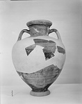 | Description: | Central part of body restored. High flaring ring foot and plump ovoid body; slightly concave neck, rounded rim; below rim, raised ring around neck; rolled vertical handles, from shoulder to middle of neck. Entirely covered with dull streaky glaze, black to brown, except for four reserved bands on the shoulder below the handle attachments; the neck is entirely reserved and decorated at back and front with double concentric circles, with double sigma to each side. | |