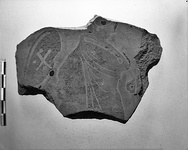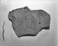 | Description: | From the wall of a large pot. Draped figure walking right; glaze almost all peeled off. Behind the figure, in the field, a large shield like disc, with a cross in it. | |