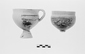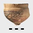 | Description: | Profile of cup complete; conical base and both handles missing. Shape similar to P 17439 (ΞΞ210). Covered inside and out with dull glaze, black to red, much worn. Zigzag between bands on rim; reserved band inside rim, and dot at contre of floor. ADDENDA P 17439: High conical base and deep rather pointed body; high rim, slightly inset. One vertical band handle (there may have been two). | |