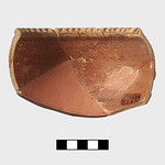 Description:   Wall and rim fragment from a cup similar to P 17441 (ΞΞ 212). Short lip, slightly inset. Dull red glaze, somewhat worn, over all; a reserved band inside the lip filled with short vertical strokes. Attachments for vertical handle preserved at one edge.