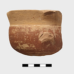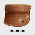 | Description: | Rim and upper wall fragment preserving attachments of vertical band handle. High rim, inset and tilted slightly outward. Covered over all with thick dull red glaze; a reserved band inside the lip, and the handle banded. Glaze completely gone from rim outside. | |