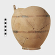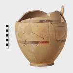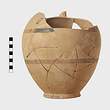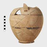 | Description: | Preserved to shoulder, with the stump of one vertical handle. Flaring ring foot and ovoid body, unglazed. Band on outer face of foot, around body half way to shoulder, and below shoulder. A large drop of glaze on shoulder on one side. Traces of St. Andrew's cross on handle. | |