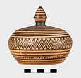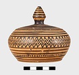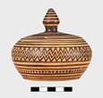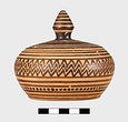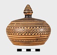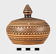 | Description: | Pyxis intact. Triple zigzag around body, between bands; lower on body, a row of dots. Lid intact, banded, with conical banded knob. | |