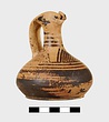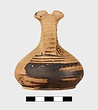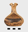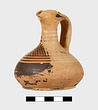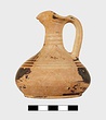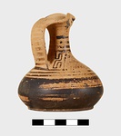 | Description: | Intact save chip from end of spout. Trefoil mouth; tall narrow neck; squat body; low flat base. Shoulder decorated with three large crisscrossed triangles and a single line of vertical maeander beside the handle on one side. Bands around neck and below shoulder; the lower part of the body black. Worn black glaze. | |