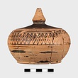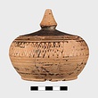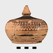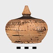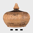 | Description: | Pyxis, mended from many pieces, chips missing. Triple zigzag band around body; narrow bands above and below. Lid, mended from two pieces, chips missing. Black save for bands at edge. Banded conical knob. Black to brown glaze, worn on body and knob. | |