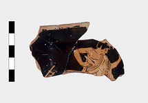 | Description: | Red figure oinochoe fragment mended from four fragments; a few chips missing. Part of the rim and wall of a mug (oinochoe shape VIII). On the exterior, the upper part of a youth looking right; his cloak over his left shoulder, his left arm raised; his right hand on his hip. Behind him an uncertain object; beyond, next to the break, the outline of the head and shoulder of another figure, left. No relief contour. Inside, a reserved line at the junction of lip and wall. Inscribed below: <graphic> | |