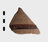 | Description: | From the wall of a semi-glazed krater. Incised outside: <graphic> Dull black glaze inside; band outside. | |