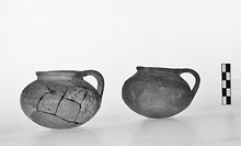 | Description: | Fragments missing from body and rim. Round bottomed pot with round mouth, short rim and one handle. Micaceous cooking ware. | |